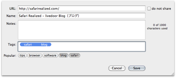 SafariからDeliciousブックマークの閲覧と投稿が出来るようになる拡張機能"DeliciousSafari"のMacOS X 10.6(Snow Leopard)に対応したバージョン1.8がリリースされています。