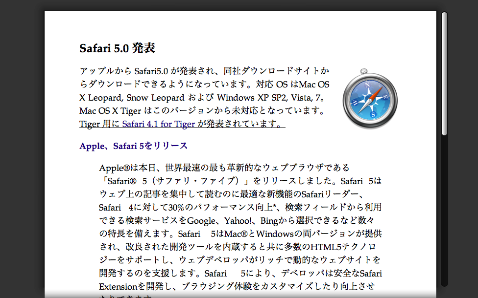 Safari 5には、ウェブデベロッパがメディアリッチな体験を創造するのに不可欠な多数のパワフルなHTML5機能が内蔵され、これにはHTML5ビデオのフルスクリーン再生やクローズドキャプション(字幕)機能なども含まれます。Safari 5に搭載されたその他のHTML5機能には、ジオロケーション(位置情報)、セクション化のための要素(section、article、nav等)、ドラッグ&ドロップを可能にする属性(draggable)、HTML5フォーム検証、HTML5 Ruby、HTML5 AJAX History, EventSource, WebSocketなどがあります。